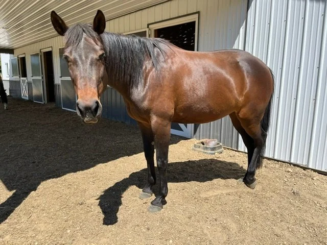 Ellie is a graceful, athletic bay Quarter Horse and the respected head mare of our herd. Quiet, thoughtful, and wise, Ellie takes her role seriously—always watching out for the wellbeing of those around her, both human and horse.